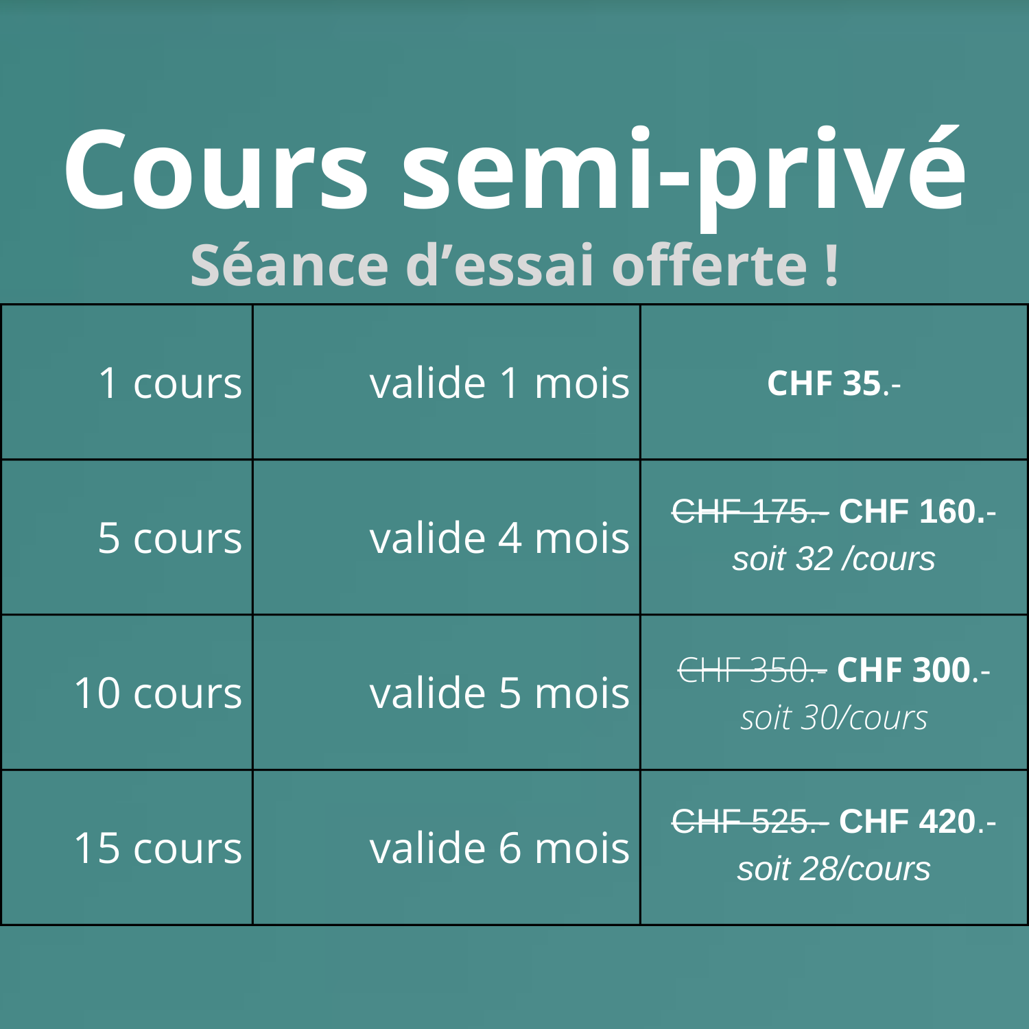 NB : Une fois l’achat effectué, les cours doivent être utilisés dans le délai imparti selon la formule choisie (entre 1 et 6 mois).